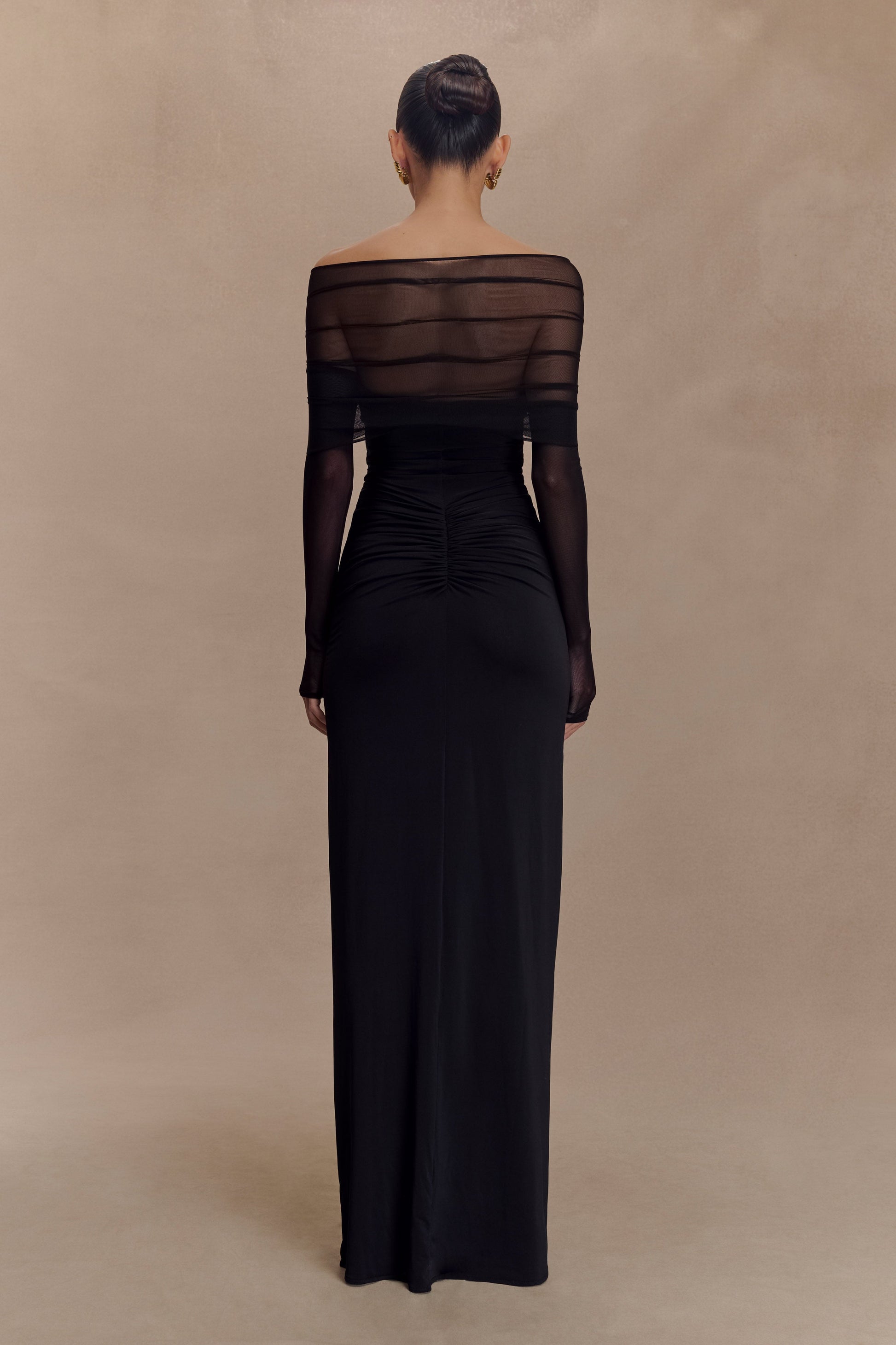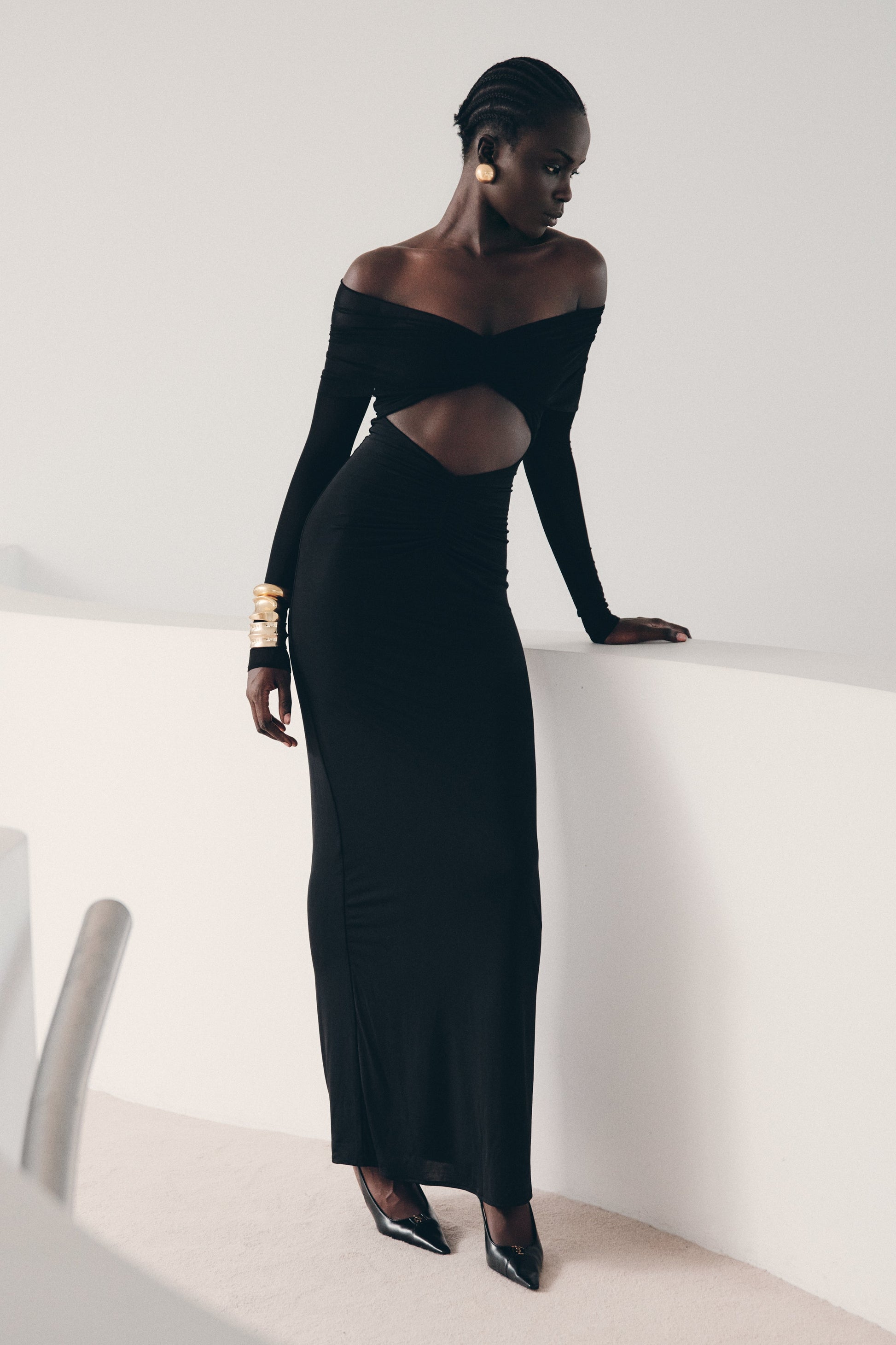 Destaca bajo los reflectores con el Vestido Maxi Slinky y de Malla RAFAELLA, una prenda icónica que combina textura y forma sin esfuerzo. Presenta un escote profundo en V y mangas de malla con panel de hombro transparente, en contraste con el busto y la falda de punto elástico para un ajuste favorecedor y ceñido al cuerpo. Los frunces en la parte delantera y trasera esculpen la silueta, mientras que el audaz recorte frontal añade el toque justo de atractivo. Completamente forrado, con falda recta y largo maxi, este vestido es tu opción perfecta para la sofisticación nocturna con un giro moderno.